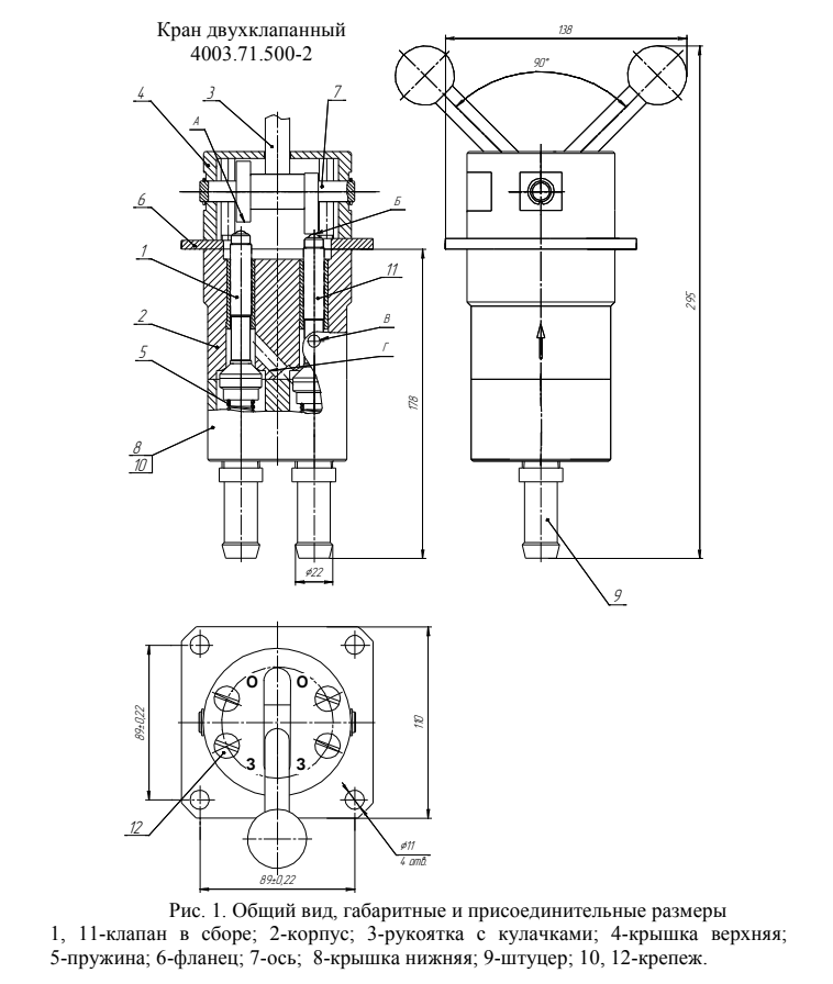 Кран двухклапанный (в дальнейшем кран см. рис. 1 и 2) служит для изменения направления воздуха в пневматических приводах и системах управления.