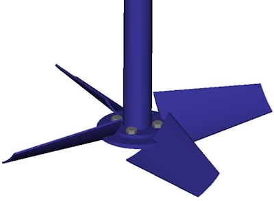 В мешалках с лопастями типа "ТУРБИННОЕ КРЫЛО" профиль разработан таким образом, что создающийся тороидальный вихрь переноса жидкости из области, лежащей ниже плоскости вращения крыльев в верхнюю область, создает мощную подъемную силу осевого потока, а значения угла атаки крыла рассчитаны так, что набегающий поток среды создает минимальную лобовую нагрузку. Наличие стреловидности крыла также позволяет улучшить обтекание потоком раствора периферийной части мешалки.