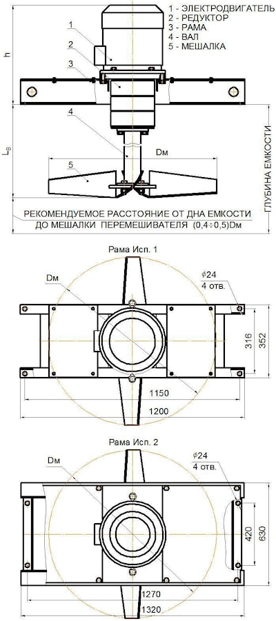 Перемешиватель механический лопастной на базе волнового редуктора "герметичный корпус" с мешалкой "турбинное крыло",